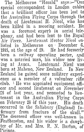 The Melbourne "Herald" says:—"Our special correspondent in London cables that a brilliant officer has been lost to tho Australian Flying Corps through the death of Lieutenant H- Nicol, who has been killed in a mooring accident. Ho was a foremost expert in aerial telephony, and had been lent to the Royal Air Force. Lieutenant Hector Nicol unlisted in Melbourne on ■ December G, 1915, at tho age of 29. He had formerly been a railway operating porter, r.nd was a married man, his widow now living at Avoca, Lieutenant Nicol was born at Mabono, New' Zealand. In New Zealand he gained some military experience as a member of a volunteer rifle club. * Ho was appointed equipment officer and second lieutenant on November 28 of last year, and promoted to lieutenant in the Australian Flying Corps on February 28 of this year. His death occurred in the Salisbury (England) Infirmary from fracture of the skull." The deceased officer was well-lcnown in Featlierston, and his widow is a daughter of Mr. and Mrs. R. N. Barton, of Pirinoa,