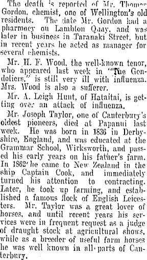 The death s reported «f Tifr. Tlioni"Gordon, chemist, ono of Wellington's old residents. Thu date Mr. Gordon had ;i pharmacy on Lambton Q.wy. and was later in business in Taramilri Street, but in recent years he acted as manager for several chemists. Mr. .11. F. Wood, the well-known tenor, who appeared last week in '"file Gondoliers," is stil! very ill with 'influenza. Mrs. Wood is also n sufferer. Mr. A. Leigh Hunt, of Hataitai, is getting over an attack of influenza. Mr. Joseph Taylor, one of Canterbury's oldest pioneers, died at Papanui last week. He was born in 1836 in Derbyshire, England, and was educated at the Grammar School, Wirksworth, and passed his early years on his father's farm. In 1862' he came to New Zealand in the ship Captain Cook, and immediately turned his attention to contracting. Later, he took up farming, and established a famous flock of English Leicestors. Mr. Taylor was-a great lover of horses, and until recent years his services wore in frequent request as a judge of draught stock at agricultural shows, while as a breeder of useful farm horses he was well known in alb parts of Canterbury.
