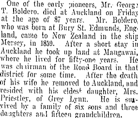 One of the early ;>ioneers, Mr.- ftcorg: T. Boldoro. died at Aucklnnd on Friday at the ago of 87 years. Mr. Boldero, who was born at Bury St. Edmunds, England, came to New Zealand in the ship Mersey, in 1859. After a short stay in Auckland he took up land at Mangawai, where he lived for fifty-ono years. He was chairman of the Uoat« Board in that district for some time. After tho death of his wifo he removed to Auckland, and resided with his eldest daughter, Mrs. Priestley, of Grey Lynn. Ho is siijvived by a family of six sons and three daughters a.n.l fifteen grandchildren.