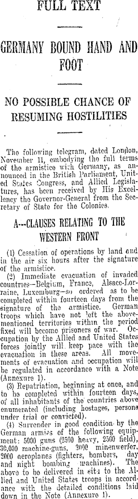 FULL TEXT GERMANY BOUND HAND AND FOOT NO POSSIBLE CHANCE OP RESUMING HOSTILITIES Tho following telegram, dated London, November 11, embodying tho full terms of tho armistice wkh Germany, as announced in the British Parliament, United Staies Congress, and Allied Legislatures, has been received by His Excellency the Governor-General from the Secretary of State for the Colonies, A—CLAUSES RELATING TO THE WESTERN FRONT (1) Cessation of operations by land and in tho air six hours after the signature of the armistice. (2) Immediate evacuation of invaded countries-Belgium, Franca, Alsace-Lor-raine, Luxemburg—si) ordered as to be completed within fourteen dnya from the signature of tho armistice. German troops which have not left the abovementioned territories within the period fixed will become prisoners of war. Occupation by the Allied and United States forces jointly will, keep pace with tho evacuation in these areas. All movements of evacuation and occupation will be regulated in accordance with a Note (Annexure 1). (3) Repatriation, beginning at once, and to be completed within fourteen days, of all inhabitants of the - countries above enumerated (including hostages, persons under trial or convicted). (4) Surrender in good condition- by the German armi« of the following equipment: 5000 guns (2500 heavy, 2500 field), 30,000 machine-guns, 3000 minenwerfer, 2000 aeroplanes (fighters, bombers, day and night bombing machines). The abova to be delivered in sita to the Allied ,ind United States troops in accordance with the detailed conditions kid down in the Note (Annexure 1).