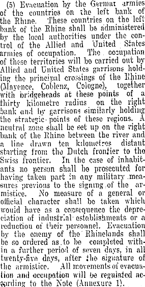 (5) Evacuation by the Gernmt armies of the countries on the left bank of the Rhine. These countries on the left bank of tho Rhine shall 1)6 administered by the local authorities under the control of the Allied and United ; States armies of occupation. Tho . oo:upatinn of these territories will bo carried out by Allied and United States garrisons holding fie principal erodings of tho Rhine (llayenci?, Coblenz, Cologne), together with bridgeheads at these points of a thirty kilometre radius on the right bank and l>y garrisons similarly holding tho strategic- points of these regions. A neutral zone shall be set up on the right bank of the. Rhino between the river and a line drawn ten kilometres distant starting from tho Dutch frontier to tho Swiss frontier. In the case of inhabitants no person shall be prosecuted for having taken part in any military .measures previous to the signing ,of the armistice. No measure of a general or official character shall bo taken which would have as a consequence the depreciation of industrial- establishments or a reductiou of their personnel. Evacuation by the onctny of the'Rhinelnnds shall be so ordered as.to be completed within a further period of seven days, in all hventy-fiyn days, after ilio signature of the armistice. All movements of evacuation and occupation will Oβ reguinied nc(Sinling to tho Note (Aniiexure 1).