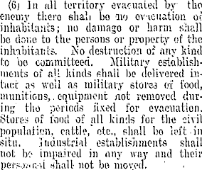 (6) ]n all territory evacuated by the enemy thero shall bo aw ovieuation oe inhabitants; no damage or harm shall bo done to the persons or property of the inhabitants. JN : o destruction of any kind to bo committeed. Military establishments of fiU kinds shall be delivered intact as well as military storas oi food, munitions,, equipment not removed during, tho ;.jonods ilxed for evacuation. Stores of food of all kinds for the civil papulation, cuttle," otc, shall bo left .in situ, jiidustrkl establishmente shall not. bo inipajred in nny way and their pei-sj.-.r.u nhall not be mov«l.