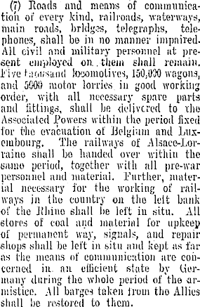 (7) Roads and means of communication of every kind, railroads, waterways, main roads, brldgss, telegraphs, telephones, shall be in no manner impaired. All civil and military personnel at present employed, on.them shall remain. Vive hidiisaiHl looomolirej, 150,iW0 wagons, and 5000 motor lorries in good working order, with all necessary spare parts and fittings, shall be delivered to ihu Associated Powers within the period fixed for the evacuation of Belgium and Luxembourg. The railways of Alsace-Lor-raine shall bo handed over within tho Biuno period, together with nil pre-war personnel and material. Further, material necessary for the working of railways in the country on the leit bank of the Rhino shall be left in situ. All stores of coal and material for upkeep of permanent way, signals, and repair shops shall be left in i>itu and kept us far as the means of communication are concerned iu. an efficient state by Ueruuiny during the whole period of the armistice. All barges taken from tho Allies shall be restored to them.