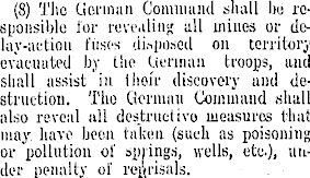 (8) Tho Ciorinun Command shall bu responsible for revealing all mines or de-lay-action fuses deposed on territory evacuated by the Ciennau troops, and shall assist in Ihoir discovery and destruction. Tho Gormnu Command shall also reveal nil destructive measures that may have been taken (such as poisoning or pollution of springs, wells, etc.), under penalty of reprisals.