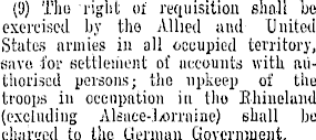 (9) Tho right of requisition shall be exercised by the Allied and United States armies in all occupied territory, save, for settlement of accounts with authorised persons; the upkeep of the troops in occupation in the Rhhielnnd (excluding Alsace-Jxirrainc) shall be charged to the German Government.