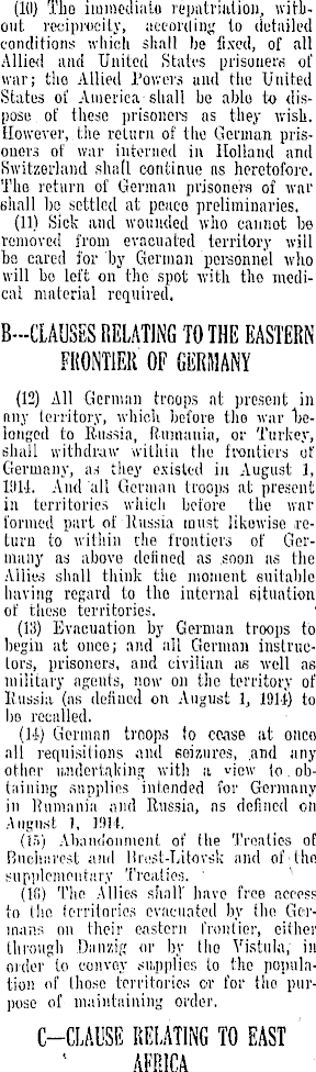 (1(1) The immediate repatriation, without reciprocity, according to detailed conditions which shall be fixed, of all Allied and United States prisoners of war; tho Allied Powers mid the United States of America shall be ablo to dispose of these prisoners as they wish. However, the return of the German prisoners of war interned in Holland and Switzerland shall continue ns heretofore. The return of German prisoneis of war shall bo settled at peace preliminaries, (11) Sick and wounded who cannot be removed from evacuated territory will be cared for by German personnel who will be left on the spot with tho medical material required. B-CLAUSES RELATING TO THE EASTERN FRONTIER" OF GERMANY (12) All German troops at present in any territory, which before the war "belonged to Russia, Rumania, or Turkey, shall withdraw within the frontiers of Germany, as they existed in August 1, 1914. And all German troops at present in territories which before the war formed part of-Russia must likowise return to within the frontiers of Germany as above defined as soon as the Allies shall think the moment suitable having regard to tho internal situation of these territories. (13) Evacuation by German troops to begin at once; and all German instructors, prisoners, and civilian as well as military agents, now on the territory of Russia (as defined on August 1, 1914} to bo recalled. (U) German troops to cease at onco all requisitions and seizures, .and any other undertaking with n "iew to. obtaining supplies intended for Germany in Rumania and Russia, as denned on August 1, VM. (l. r >) Abandonment of the Treaties of Bucharest and Hrest-Litovsk and of'the supplementary Treaties. ' (Id) Tho .Allies shall' have free access to the territories evacuated by the Germans on their eastern frontier, either through Danzig <ir by tho Vistula, in order to convey supplies to the population <if those territories or for tho purpose of maintaining order. C—CLAUSE RELATING TO EAST AFRICA