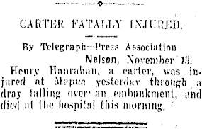 CARTER FATALLY INJURED. By Telegraph--Prcsp Afsocintion Nelson, November lit. Henry Hanralian, a carter, was injured at McipiM ycslcrdiiv through a dray falling over , an embankment, n'nd died at the Imspitiil this inoniinj,'. ■