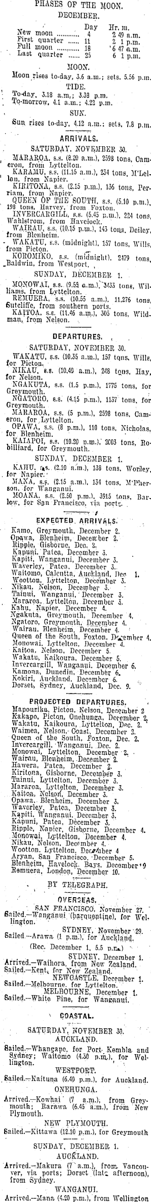 PHASES OF THE MOON. DEOEMBER. .. •' Day Hr. in. New moon 4 2 49 a.m. First quarter u 2 1 p.m. . Pull moon 18 '6 47 a.m. • La 'St quarter 25 6 1 p.m. MOON. Moon rises to-day, 3.6 a.m.; sets, 5.56 p.m. TIDE. ' 'J 0 " 0 ' 1 ?. 3.18 a.m,; 3.38 p.m. . Iq-morrow. 4.1 a.m.; 4.22 p.m. SUN. Sun, rises to-day, 4.12 a.m.; sets, 7.8 p.m. ARRIVALS. SATURDAY. NOVEMBER 30. MARAR.OA. s.s. (8.20 a.m.), 2598 tons, Oameron, from Lyttelton. KARAMU, s.s. (11.15 a.m.), 234 tons, M'Lellan, from Napier. KIRITONA, s.s. (2.15 p.m.), 136 tons, Perriam, from Napier. , QUEEN OF THE SOUTH, s.s. (5.10 p.m.) 198 tons, Harvey,' from .Foxton. INVERCARGILL, s.s. (5.45 p.m.), 224 tons Wahlstrom, from Havelock. . WAIRAU, s.s, (10.1.5 p.m.), 143 tons. Deilcy, from Blenheim. - WAKATU, s.s. (midnight), 157 tons, Wills, from Picton. _ KOROMIKO. B.s. (midnight). 2479 tons .Baldwin, from Westport. SUNDAY, DECEMBER. 1. . MONOWAI. 8-s. (9.55 a,m.).""J«3 tons, Williams, from Lyttelton. REMUERA, s.s. (10.55 a.m.). 11,276 tons, fiutcliffc, from southern ports. KAITOA, s.s. (11.46 a.m.), 30-5 tons, Wildman, from Nelson. DEPARTURES. , SATURDAY, NOVEMBER 30. WAKATU. s.s. (10.35 a.m.), 157 tqns. Wills, for Picton. 'NIKAU. 8.8. (10.40 a.m.), 248 tons. Hay, for Nelson. NGAKUTA, s.s. (1.5 p.m.), 1775 tons, for Greymouth. NGATOUO, B.S. (4.15 p.m.), 1137' tons, for Greymouth. MARAROA, s.s. (5 p.m.), 2598 tons, Cameron, for .Lvttelton. OPAWA; s.s. (8 p.m.), 110 tons, Nicholas, for Blenheim. KA.IAPOI, s.s. (10.20 D.m.),' 2C03 tons, Robilliard, for Greymouth. SUNDAY, DECEMBER 1. KAHU. r«s.. (2.10 a.m.), 138 tons, Woriley , for Napier.' MANA, s.s. (2.15 a.m.), 134 tons. M'l'horson. for Wanganui. MOANA. s.s. (2.50 p.m.). 3915 tons, Barlow, for San Francisco, via ports. - ■ I EXPEQTED. ARRIVALS. - Kamo, Greymouth, December 2. Opqwa, Blenheim, December 2. Ripple, 'Gisborne, Deo. 2. Kapun.!,' Palett, December 3. Kapiti, Wanganui, December 3. Waverley, Patea, December 3.. Waitomo, Calcutta, Auckland, Dec 1. Wootton, Lyttelton, December 3. Nikau,. Nelson, December 3. Ta-inui, Wanganui,' December 3. Mararoa,. Lytteltqii, December i. Kahu, Napier, December 4. Ngakuta, Greymouth, December 4, Ngatoro, Greymouth, December 4. Wairau, Blenheim. December 4. Queen of the South, Foxton, Dumber 4. Monowai. Lyttelton, December 4. Kaitoa. Nelson, December 5. WakatUi Kaikoura. December 5. invercargill. Wanganui. December 6. Kamona, Dunedin, December 6. ' Kokiri, Auckland, December 6. Dorset, Sydney, Auckland, Dec. 9. '"' PROJECTED DEPARTURES. Mapourika, Picton, Nelson. December 2 Kakapo, Picton, Qnehunga, December 2. Wakatu, Kaikoura, Lyttelton, Dec. 2. ' Waimea, Nelson,- Coast. December 2. Queen of the South, Foxton, Deo. 2. Invercargill. Wanganui. Dec. 2. Monowai, Lyttcltop. December • 2. • Wairau, Blenheim, December 2. Hawera, Patea, December 2. Kiritona, Gisborne, December 3. Tainui, Lyttelton, December 3. Mararoa, Lyttelton, December 3. Kaitoa, Nelson, December 3. Opawa,. Blenheim, December 3. Waverley. Patea, December 3. Kapiti, Wanganui. December 3. Kapuni, Patea, December 3. Ripple, Napier, Gisborne, December 4. .MonoTfaj, Lyttelton, December 4. Nikau, Nelson, December 4. Wootton. Lyttelton, Decfr'aber 4 Aryan, San Francisco. December 5. Blenheim, Eavelock. Bays, December'.9 Remuera, London, December 10. BY TELEGRAPH. OVERSEAS. „ ~■/■ J AN FRANCISCO, November 27. " Bailed-Wanganui'tbarquentine), for Wellington. ' • ' - e -i !. . -SYDNEY, November '29. Bailed.-Arawa (1 p.m.), for Auckland.. (Rec. December 1. 5.5 p.nO N , . „ „ . SYDNEY. December 1. Amved.-Waihora. from Now Zealand. Sailed—Kent t for New Zealand. ' ■ ~ , Newcastle;" December 1. Hailed.—Melbourne, for Lyttelton'. '■" MELBOURNE, December 1, Sailed.-White pi ne , for Wanganui, * COASTAL. . SATURDAY,' NOVEMBER 30. AUCKLAND. | Sailed.-Whangape. for Port Kembla and' Sydney; Waitonio (4.30 p.m.), for Wellington. ' ■ ■. WESTPORT. . Sailed.-Kaituna (6.40 p.m.), for Auckland. ONEHUNGA. ' Arrived— Kowhai' (7 a.m.); from Greymouth; Rar'awa (6.45' a;m.), from New Plymouth. ... NEW PLYMOUTH. Bailed—Kittaiva (12.10 p.m.), for Greymouth SUNDAY. DECEMBER 1. AUCKLAND. Arrived—Makura (7"a.m.), from, Vancouver, via ports; Dorset (lata afternoon), from Sydney. WANGANUI. Arrived— Mana (4.20 p.m.), from Wellington