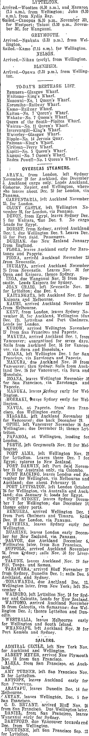 LYTTELTON. Arrived—Wootton (<UO a.m.), and Marnroa (7.5 a.m.), from Wellington; John (9.30 a.m.), from Nydia Bay. Sailed.-Canopua (6.10 p.m., November 30), for We6tport; Tainui (5.10 D.m„ November 30), for Wanganui. GREI'MOUTH. • Arrived—Ngakuta (3.30 p.m.), from Wellington. ' ; Sailed— Kamo (7.15 a.m.). for Wellington. NELSON. ' Arrived.—Nikau (early), from Wellington. BLENHEIM. Arrived.-Opawa (7.30 p.m.), from Welling, ton. TO-DAY'S BERTHAGE LIST. Remnera-GlasEOw Wharf. Waitomo-King'a Wharf. Monowai-No.. 1 Queen's Wharf. Koromiko—Railway Wharf. Kamo-liaihvay Wharf. Kaitoa-No. 7 'Queen's Wharf. Wakatu~No. 7 Queen's Wharf. Queen of the South-Pipitca Wharf. Wuirau-No. 11 Qi-.een's Wharf. Invcrcargill-King's Wharf. Wavcrley—Glasgow Wharf. Kipple-N.o. 14 Jervois Quay. Paloona—King's Wljarf. Kiritoua—Ferry Wharf. Kapiti—No. 5 Queen's Wharf. Kapuni -No. 7 Oueen's Wharf. Baden Powell-No. 1 Queen's Wharf. / OVERSEAS STEAMERS. ARAWA, from London, left Sydney November 29 for Auckland, due December 3. Auckland cargo only. Loads Auckland, Gisborne. Napier, and Wellington, whero . she leaves about Dec. 20 for Loudon, via .Panama. CARPENTARIA, left Auckland November 23, for London. OLUNY CASTLE, left, Wellington November 28, for London, via Panama. DEVON, from Egypt, leaves Sydney Dec. 5 for. Wnitara, "Hue Dec. 9. No cargo Loads for Egypt. DORSET, from Sydney, arrived Auckland Dec: 1, due Wellington Dec. 9. Leaves Dec. 13 for Port Said. Passengers. DURHAM, due New. Zealand January from England. FLORA, leaves Auckland early for Rarotonca and Papeete^ FIONA, arrivJd Auckland November 23 .from Newcastle. . IHTJJIATA, arrived Auckland November 23 from Newcastle. Leaves Nov. 30 for Opiia and Kaipara, thenco Sydney. INGA,' due Wanganui Nov. 28 from Newcastle. Loads Kaipara for Sydney. JOAN ORAIG. left Newcastle Nov. 28 for Lyttelton: due Dec. 4. KAITANGATA, left Auckland Nov. 27 for Kaipara o.nd Melbourne. KAURI, arrived Auckland November 23 . from Melbourne. KENT, from London, leaves Sydney Novembpr 30, for Auckland, Wellington (tins Dec. 12). Lyttelton and Port Chalmers. Loads for London. • KUROW, arrived Wellington November 27 from San Francisco and Papeete. MAKURA, arrived Auckland Dec. 1. from Vancouver; quarantined for seven days; Sails from Auckland Dec. 16 for Vancouver, via Suva and Honolulu. • MOANA, left Wellington Dec. 1 for San Frjuicipco. via liarotonna. and Papeete. MAKURA..' due Auckland Nov. 30 from Vancouver; then Sydney. Sails from Auckland Dec. 16 for Vancouver, via Suva and Honolulu. MOANA. leaves Wellington November 30 for San Francisco, , via Rarotonga and Papeete. . MANUKA, leaves Sydney early for Wellington. ■MOERAIU, ftaves S3'dney early for Wellington. NAVUA. at, Papeete, from' Son Francisco, due Wellington .early. NIAGARA, feft Auckland November 16 for Vancouver; diie back December 29. OPIHI, left Vancouver November 16 for Wellington; due December 15; thence Lyttelton. ■ PAPAROA, at Wellington, loading for London.. PERTH, left Greymouth Nov, 22 for.Met bourne. PORT ALMA, left Wellington Nov. 29 for Lyttelton. Leaves there Dec. 7 for Egypt; returns to New Zealand. PORT. DARWIN, left Port Said November 15 for Australia only, via Colombo. PORT HACKING, leaves London end November for Wellington, via Melbourne and Auckland; due about February '10. PORT LYTTELTON, left London October '26 for Wellington, via Australia and Auckland; du6 January 5; loads for Egypt. PORT SYDNEY, leaves Sydney December 7 for Wellington; duo December 14, thente other ports. ' REMUERA. arrived Wellington Dec. 1 from Port Chalmers and Timaru. Sails, Dec. 10 for London, via Panama. RIVERINA, leaves Sydney" early for Wellington. ; P.UAHINE, leaves London early December for New Zealand, via. Panama. JpALTOR, due Auckland December 6, ' Wellington later, from San Francisco, .SUFFOLK,' arrived Auckland November 26, from Sydney; sails' Nov. 30 for Liverpool. ■' '■■■ • TALUNE. leaves Auckland Nov. 29 for Fiji;' Tonga, and Samoa. TARAWERA,-arrived Bluff November 27 from ■Sydney, Dunedin Dec. 1; sails.Deo. 5 Auckland, and Sydney. ,TONA WANDA, due Auckland Dec. 12, Wellington later, from New York; left November 4.WAIHORO, left Lyttelton Nov. 24 for Sydney and Calcutta.'Loads for TJow Zealand. WAITOMO, arrived Auckland November 25 from Calcutta, via Samarane: due Wellington Dec. 3; thenpo Lyttelton and Dunedin. , WESTRALIA, leaves Melbourne early for Wellington and South Island. WHANGAPE, left Auckland Ncv. 30 for Port Kembla and Sydney. SAILERS. ADMIRAL CECILE, left New York Nov. for Auckland and Wellington. ALBERT MEYER, arrived New Plymouth Nov. 18 from San Francisco. ■•' r ' ALEXA, from San Francisco, at Auckland. AMY TURNER, left San Francisco Noy, 25 for Lyttelton. ANTIOPE, leaves Auckland early for San F".trei«:co. ARATAPU. [eaves Dunedin Dec. 14 for Melbourne. . / ARYAN, leaves Wellington, Doc. 5 for San Francinco. . _ C. D. BRYANT, arrived Bluff Nov. 26 from San Francioco. Due. Wellington later. DANIEL, from San Francisco, leaves Waiiraniii earlv for Sydney. DARTFORD. due Vancouver towards end Deo. from Wellington. I DUKU2SNE. left San Franciseo Sep. -12 for Lyttelton.