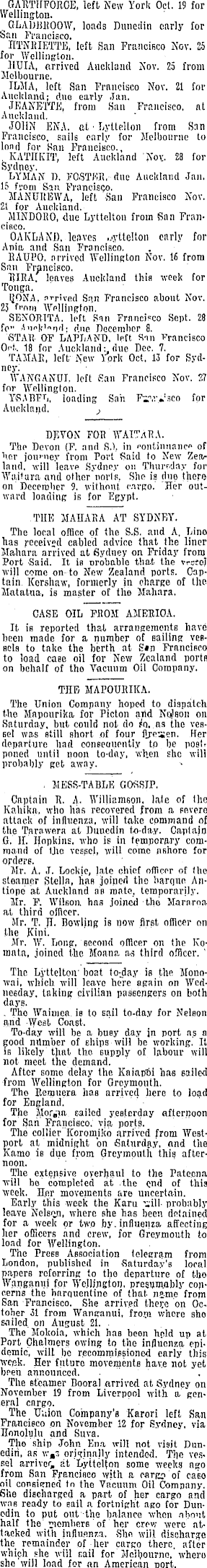 GARTHFOROE, left New York Oct. 19 for Wellington. GLADBROOW, loads Dunedin early for San Francisco. HTNRIETTE, left San Francisco Nov. 25 for Wellington. lIUIA, arrived Auckland Nov. 25 from Melbourne. ILMA, left San Francisco Nov. 21 for Auckland; due early Jan. JEANETTE, from San Francisco, at Auckland. JOHN ENA. at ■ Lyttelton from San Francisco. sail 6 early for Melbourne to loud for Kan Francisco., . KATHKIT, left Auckland Nov. 28 for Sydney. LYMAN D. FOSTKR, due Auckland Jan. 15 from San Francisco. MANUREWA, left San Francisco Nov. 21 for Auckland. MINDORO, due Lyttelton from Ban Francisco. OAKLAND, leaves •jyltelton early for Ania and San Francisco. RAUPO. arrived Wellington Nov. 16 from Snn Francisco. RIRA. leaves Auckland this week for Tonga. R.ONA, nrrived San Francisco about Nov. 23 from Wellington. SENORITA. left San Francisco Sept. 28 fc ,lii"!.- , "0'l; due December 8. STAR OF LAPLAND, left Sin Francisco Oct.. 18 for Auckland;, due Dee. 7. TAMAR, left New York Oct. 13 for Sydney; WANGANUI, left fian Francisco Nov. 27 for Wellington. YSABFT,, loading Sa'n FzuVsco for Auckland. i DEVON FOR'WAITARA. The Devon (F. and 8.1, in continuance of her journey from Port Said to New Zealand, will leave Sydney on Thurrday for Waitara and other norls, She is due there on December 9. without cargo. "Her outward loading is for Egypt. THE MAHARA AT SYDNEY. The local office of the S.S. and A. Lino has receivjd cabled advice that the liner Mahara arrived at Sydney on Friday from Port Said. It is probable that the vrstol will come on-to New Zealand ports. Captain. Kershaw, formerly in charge of the Matatua, is master of the Mahara. CASE OIL FROM AMERICA. It is reported that arrangements have been made for a number of sailing vessels to take the berth at S«n Francisco to load caße oil for New Zealand ports on behalf of tho Vacuum Oil Company. THE MAPOURIKA. The Union Company hoped to dispatch tho Mapourika for Picton arid Kojaon on Saturday, but could not do so.. as tho vessel was still short of four fircxen. Her departure had conseauently tp be postponed until noon to-day, when she will probably get away. . MESS-TABLE GOSSIP. Captain R. A. Williamson, late of the Kahika. who has recovered from a severe attack of influenza, will take command of the Tarawera at Dunedin to-day. Captain G. H. Hopkins, who is in temporary command of the vessel, will come nshore for orders. Mr. A. J. Lockie, Lite chief officer of the steamer Stella, lias joiped the barque Antiope at Auckland as mate, temporarily. Mr. F. Wilson, has joined the Mararoa. at third officer. Mr. T. H. Bowling is now first officer on the Kini. Mr. W. Long, Becond officer on the Komnta, joined the Moana as third officer. ' The Lyttelton' boat to-Jay is the Monowai, which will leave here again on Wednesday, taking civilian passengers on both days. . Tho Waimea. is to sail to-day for Nelson and West Coast. To-day will be a busy day in port as a. good ndmber of ships-will be working. It iB likely that tho supply of labour will not meet the demand. After some delay the Kaiapbi has sailed from Wellington for Greymouth. Tho Remuera has arrived here to load for England. The ilofoia sailed yesterday afternoon for Sari Francisco, vja ports. The collier Koromjko arrived from Westport at, midnight on Saturday, and the Kamo is due from Greymouth this, afternoon. The extensive oyerhaul to the Pate.cna will he completed at the end of this week. Her movements are uncertain. Early this week the Karu ■sill- probably leave Nelson, where she has been detained for a week or two by. influenza affecting her officers and crew, for Greymouth to load for Wellington. The Press Association teleirram from London, published in Saturday's local papers referring to tho departure of tho Wanganui for Wellington, presumably concerns the harquentine of that name from San Francisco. She arrived thete on October 31 from Wanganui, from where sho sailed on August 21. . The Mokoia, which has been held up at Port Chalmers owing to the influenza epidemic, will be recommi'ssioned early this week. Her future movements have not yet been announced. The steamer Booral arrived at Sydney on November 19 from Liverpool with a general cargo. The U;;ion Company's Karori left San Francisco on November 12 for Sydney, via Honolulu and Suva. The ship John Ena will not visit Dunedin, as w.- originally intended. The vessel arrive, at Lyttelton some weeks ago from San Francisco with a cargj of case oil consigned to the Vacuum Oil Company. She discharged a part of her cargo and was ready to sail a fortnight for Dunedin to put out the balance when about half the members of her crew were attacked with influenza. Sho will discharge the remainder of her enrco there, after which she will nail for Melbourne," where sho will load for an American port.