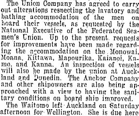 Tho Union Company has agreed to carry out alterations resnecting the lavatory and bathing accommodation of the men on hoard their vessels, as requested by the National Executive of the Federated Seamen's Union. Up to tho present, requests for improvements have been made regarding the accommodation on the . Monowai, Moana. Kittawa, Mapourika. Kaianoi, Kamo. and Kanna. An inspection of vessels will also be made by the union at Auckland a.nd dunedin. The Anchor Oomoaiiy and other shipowners are also being approached with a view tp hnvinE the sanitary conditions on boarjd shin improved. The Waitomo left Auckland on Saturday afternoon for-Wellington. She is due here
