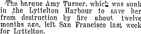 •The barque Amy Turner, whicU was sunk in v the Lyttelton Harbour to save her from destruction by fire about, twelve months p.eo, left San Francisco last week for Lyttelton.