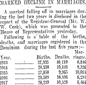 MARKED DECLINE IN MARRIAGES. A marked falling off in marriages during the last two years is disclosed in the report of the ■Registrar-General (Mr. AV. AV. Cook), which was presented to the House of .Representatives yesterday. Following is a' table of the births, "deaths, and , marriages registered in tha Dominion diiiiing the last five years :— MarYear. Births. Deaths. riaßcs. l<ll3 : 27,035 10110 8,81(1 mu 28.338 10.148 0,126 1915 27,850 0,!!6r) lO.dfil 1910' 28,50!) 10.508 8,231 1917 28,239 10,528 MM