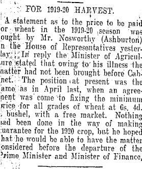 .:':-: FOE 1919-20 HARVEST. ! A statement as to the price to be paid or .wheat in the 1919-20 ,seiison was ought, by Mr. Noswortliy' (Ashburtori) a the House of Kepresontatives yesterlayj^ln, reply the: Minister of Agriculture, jstated that owing to'his illness the natter had not been brought before Calv net.'- v The position iat present was the ame:'a3 in April last ; when an agreenent was'come'to fixing the minimum jTice-for all grades of wheat at 6s. id. i bushel, with a free market. Nothing iad been done in the way of makih" ;uarantee for the 1920 crop, "but he hoped hat he would be able to have the matter ;onsidered before the departure of the Wme Hinister and Minister of Finance,