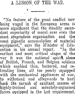 A.LESSON.Of THE WAK. > _____ "No feature of the great conflict now being waged in the' European arena is more significant that the steadily ascendant superiority of moral, over even the niost stupendous organisation and the most gigantic accumulation of material equipment," says the Minister of Education in his annual report. "In the earliest and most critical stages of the war it was the national' spirit alone of British, French, and Belgian soldiers which enabled thin, battered, and retreating lines, all too poorly equipped with the mechanical appliances of war, to withstand and aftepvards to hurl back' the onrush of exultant masses of highly-trained and minutely-organised forces equipped to the hist requirement.