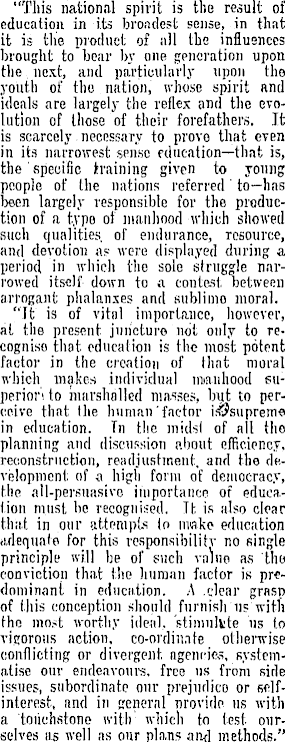 "This national spirit is the result of ■ education in its broadest sense, in that it is the product of all the influences brought to bear by one generation upon the next, and particularly upon the youth of the nation, whose spirit and ideals are largely the reflex and the evolution of those of their forefathers. It is scarcely. necessary to prove that even in its narrowest sense education—that is, the specific training given to young people of the nations referred' to—has been largely responsible for the production of a type of manhood which showed such qualities, of endurance, resource, and devotion a? were displayed during a period in which the solo struggle narrowed itself down to a contest, between arrogant phalanxes and subliino moral. "It is of vitnl importance, however, at the present juncture not only to recognise that education is the most potent factor in the creation of that moral which makc-M individual manhood superiors to marshalled masses, but to perceive that the human'factor iSiJsupremfi in education. Tn the midst of all the planning and discussion about efficiency, reconstruction, readjustment, and the development of a high form of democracy, the all-persuasivo importance of education must be recognised. It is also clear thiit in our attempts lo make education adequate for this responsibility no single principle will be of such vnluo as tho conviction that the human factor is predominant in education. A clear grasp of this conception should furnishus with the most worthy ideal, stimulate us to rigorous action, co-ordinate otherwise conflicting or divergent, agencies, systematise our endeavours, free us from side issues, subordinate our prejudice or sflf,interest, nnd in general provide us with a touchstone with which to test ourselves as well as our plans and methods."
