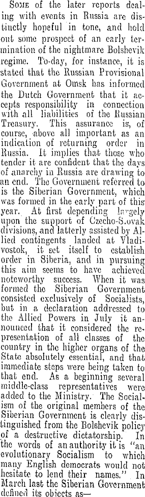Some of the later reports dealing with events in Russia are distinctly hopeful in tone, and hold out some prospect of an early termination of the nightmare Bolshevik regime. To-day, for instance, it is stated that the Russian Provisional Government at Omsk has informed the Dutch Government that it accepts responsibility in connection with all liabilities of the Russian Treasury. This assurance is, of course, above all important as an indication of returning order in Russia, it implies that those who tender it are confident that the days of anarchy in Russia are drawing to an end. The Government referred to is the Siberian Government, which was formed in the early part of this year. At first depending largely upon the support of Gzccho-S.uvak divisions, and latterly assisted by Allied contingents landed at Vladivostok, it set itself to establish order in Siberia, and in pursuing this aim seems to have achieved ■noteworthy success. When it was formed the Siberian Government consisted exclusively of Socialists, but in a declaration addressed to the Allied Powers in July it announced that it considered the representation of all classes of the country in the higher organs of the State absolutely essential, and that immediate steps were being taken to that end. As a beginning several middle-class representatives were added to the Ministry. The Socialism of the original members of the Siberian Government is clearly distinguished from the Bolshevik policy of a destructive dictatorship. In "the words of an authority it is "an evolutionary Socialism to which many English democrats would not hesitate to lend their names." In March last the Siberian Government defined its objects as—