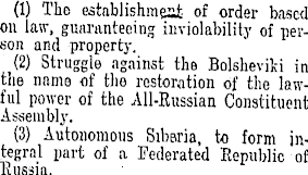 (1) The establishment of order based on law, guaranteeing inviolability of person and property. (2) Struggle against the Bolsheviki in the name of the restoration of the lawful power of the All-Eussian Constituent Assembly. (3) Autonomous Siberia, to form integral part of a Federated Republic of Russia.