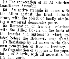 (4) The convocation of an All-Siberian Constituent Assembly. (5) An active- etruggle in union with tlie Allies against the Brest Litovsk Peace, with the object of finally attaining a universal democratic peace. (6) Restoration of friendly relations with the Allied Powers on the basis of the treaties and agreements which existed before tho Bolshevik coup d'etat. (7) Resistance by all means to the German penetration of Russian territory. (8) Organisation of supplies to the populatioii of Siberia, with all necessities for life and work.