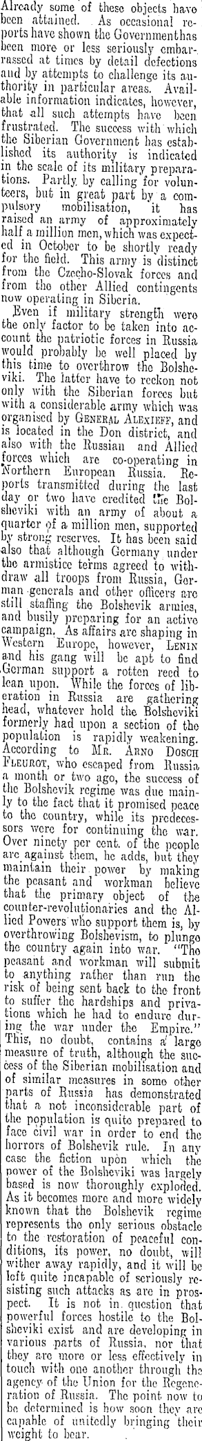Already some of these objects have been attained. . As occasional reports have shown the Governmenthas been more or less seriously embarrassed at times by detail defections and by attempts to challenge its authority in particular areas. Available information indicates, however, that all such attempts havo been frustrated. The success with which the Siberian Government has established its authority is , indicated in the scale of its military preparations. Partly, by calling for volunteers, but in great part by a compulsory mobilisation, it has raised an army of approximately half a million men, which was expected in October to be shortly ready for tho field. This army is'distinct from the Czecho-Sloyak forces and from tho other Allied contingents now operating in Siberia. Even if military strength were the only factor to be taken into account the patriotic forces in Russia wquld_ probably be well placed by this time to overthrow the Bolsheviki. The latter have to reckon not only with the Siberian forces but with a considerable army which was organised by General Alexieff, and is located in the Don district, and also with the Russian and Allied forces which are co-operating in Northern European Russia. Reports transmitted during the last day or two have credited 'ue Bolsheviki with an army of about a quarter pf a. million men, supported by strong reserves. It has been said also that although Germany under the armistice terms agreed to withdraw all troops from Russia, Gorman generals and other officers arc still staffing the Bolshevik armies, and busily preparing for an active campaign. As affairs arc shaping in western Europe, however, Lenin and his gang will be apt to find .German support a rotten reed to •loan, upon. While the forces of liberation in Russia are gathering head, whatever hold the Bolsheviki formerly had upon a section of the population is rapidly weakening. According to Mr. Arno Dosch Fleurot, who escaped from Russia a month or_ two ago, the success of tlie Bolshevik regime was due mainly to the fact that it promised peace to the country, while its predecessors were for continuing the war. Over ninety per cent, of the people arc, against them, he adds, but they maintain their power by making the peasant and workman believe that the primary object of the counter-revolutionaries and the Allied Powers wlio support them is, by overthrowing Bolshevism, to plunge the country again into war. "The peasant and workman will submit to anything rather than run the risk of being sent back to the front to suffer the hardships and privations which he had to endure during the war under the Empire." This, no doubt, contains a' largo measure of truth, although the success of the Siberian mobilisation and of similar measures in somo other parts of Russia has demonstrated that a not inconsiderable part of the population is quite prepared to face civil war in order to end the horrors of Bolshevik rule. In any case the fiction upon which the power of the Bolsheviki was largely based is now thoroughly exploited. As it becomes more and more widely known that the Bolshevik regime represents tho only serious obstacle to the restoration of peaceful conditions, its power, no doubt, will wither away rapidly, and jt will be Icfb quite incapable of seriously resisting such attacks as are in prospect. It is not in. question that powerful forces hostile to the Bolsheviki exist and are developing in various .parts of Russia., nor that they arc more or less effectively in touch with ono another through the agency of the Union for the Regeneration of Russia. The point now to bo determined is how soon they arc capable of unitedly bringing their weight to bear.