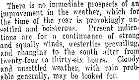 There is no immediate prospects of an improvement in the weather, which for the time of the year is provokingly unsettled and boisterous. Present indications are for a continuance of strong and squally winds, westerlies prevailing, and ckingiiu to tho south after from twenty-four to thirty-six hours. Cloudy anil unsettled weather, with rain probable generally, may be looked, for.