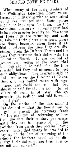. SHOULD BOTH. BE PAID?. When many of the mala teachers of tho Wellington Education Board volunteered for military service or were called up it was arranged, that their places should be kept open for them. In the meantime temporary appointments- had to be made in order to carry on. Now some of these men are returning, and wish to take up their places onco more. There are times, however, when there is an hiatus between the time , they ere discharged from the Defence Forces and the time they reassume their duties with the Education Board. It - was decided at yesterday's meeting of the board that the men should bo paid for the time specified, but they had no money to meet such obligations. The chairman said ha had been to see the Director if Kducation, who was hedged round with regulations, and could not see that two should be paid for the one job. He had afterwards seen the Minister, who appreciated the position, and said it would bo all right. On the motion of the chairman,' it was decided:—"That the Department bo urged to provide tho necessary funds for the payment of returning soldiers from tho date their military pay ceases until they can be reinstated in the positions/from which they obtained leave; consequently, that money be provided to piiy up to the date of reopening of the schools the teachers appointed to discharge their duties during their absence, on military service."
