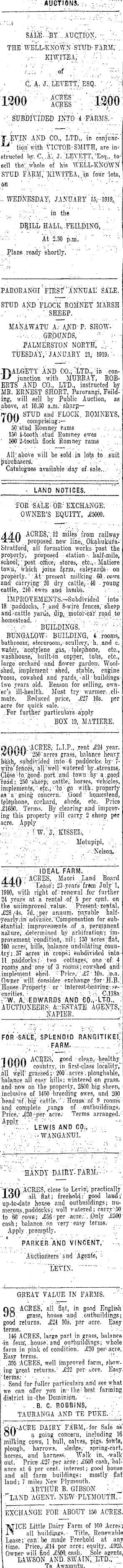 ;/••• auctions,:; y : '^~:';"" sale--'-by.'.. auction. ■■; ' ;'■ ' the' well-kno w.n -stud- farm; .. '■,••■■ kiwjtea; , 7 :■'■■ '■ I.:L ■ . ; of _.; , : ;';. ; - v - Ca.j.l'eatetT.'esq. ■ ■;;. '' ; - .isoa'-^icll-'/;^ : ; : SUBDiriDED INTO 'i FARMS.- • . TJVIN AND CO., LTD.., in conjunc-' -^' tioV T>ith VICTOR- SMITH, are inBtructed C..AV J; XEViTT, '"Esq.. . tosell th6;;..w\iole of hie STUD FARM,'' iaWITEA,.; : iii four lots, on ' ' -..-■.' ' ■■.-■-• ".. WED'NESDAYi JANOARY' 15,:-1919,/" " . : : .'■'" •; ; in the HALL, .FEILDING, •'••'•■■■ : At 2.30 p.m. '' '" '"' ' ;. Plane, ready shortly. ''." ". ' "'. : ' PARORANGI : FIRST"ANNUAt SiLE. STUD AND FLOCK R.OMNEY MARSH .-"■ ' ..,." ....'■.'.SEEEP. MANAWATU A.'.- AND 'P. SHOW- • ••.■. :. ./GR.bUNDS,' ■■■•■■ -• - PALMERSTON NORTH, .". .'' TUESDAY,'JANUARY 21; 1919.- - ■■- D ALGETY AND OO.i"LTD. r iij conjunction with MURRAY, ROBERTS AND CO., LTD., instructed by MR, ERNEST SHORT, Parorahgi, Feilding, will eell by Public Auction, as above, at 10.30 ajil.' pharp— 'lyrv/k.STUD and FLOCK. ROMNEYS, i VxJ comprieiug:— 50; stud Romne'y iams .■ .-. ,■. : 150 i-tooth>stud Romney ewes ..--... ' 50ff 2-tooth flock Bomney rams AH; above will be sold an ldte. to. .-suit. -p'u'rqliasers". ■ ".. ■ "'• • .. • ■'.'■.. . . Catalogues available -day of. 6a1e... ■. > LAND NOTICES. FOR'SALE^OR : EXCHANGE; ••■ OWNER'S EQUITY, i'sooo. AX(\ ACRES,'; 12 miles'' from railway irrrU proposed. new line,. Okahukufa--Stratford; all formation works past the property, proposed • station- : half-.mile,' school;;post -ottice',- stores, etc.-,-. Matiere :towii,; which joius farm, ealeyards: on property.' At' present milking. GO. cows, and , carrying '20 dry cattle,-"- 40 -young .cattle,. 230' ewes and lamb's.. ;: . : iMPRO.VEM.ENTS.-Subd'ivided "into"18 -paddocks,."-..and 8-wire. fences; slieep aud-cattle yards,..diD.-mofoKcar road.to;' homestead. ,- • ~ ■ •'•. '. .■.■"-.'■■ ■:•. •-: BUILDINGS. ■ '•■•■ ■'•' ;•• BUNGALOW.; BUlLDlNG,'i'.rooms, bathrooin'i storeroom,■■ -scullwry/'h. .and c. water, 'acetylene gas, -telephone, etc., washhouse, built-in copper, tubs, etc., large orchard and flower garden-. Wqolshed, implement - shed, stable/, engine Vooin, cowshed and yards, -nil ■ buildingstwo years old. Reason for selling, owner's ill-health.' Must try warmer-..cli-mate. Reduced price, ,£27 10s. per acre for quick sale ;. '/ For further "particulate, apply ■■"■ :.";'■'.; . BOX 19, MATIERE. rtAAA.-ACRES,- L.1.P., .rent Mi year. iSixjVM '250;acre3 grass,, balance heavy. bush, sn'bdi.Tided into -6. paddocks by.7wire feticev'all'well-'watered'bv.sti'eains.. -io.'good, port .'and town vby- a ;goo.d road; 250 ■sheep/ cattle',! horaea, vehicles, implements,'. etc.; ; 'to"- go . with., property as'a'going concern.' .Good' honiesteaq, tfUphone, orchard, sheds, etc. Price Terms. By clearing'and improving this property .will carry. 2 eneep per acre. Apply . ' ' •.'■'. .'..'' >-- v ,;/ : : rw'/j;. ; kissel, ; ' ■'■■' ;;•:■.■"'•..••.' '.'.■.■..-•■' Motupipi, •:". . "■''■'.; ■ ; :'• ■ .-..Nelson.. ■•; ■;■'•■. IDEAL-FARM. ... / iA A- -ACRES, .Maori ..Land, Board rfxU ' "lease; 23-year's"frem July , 1, 1910, With right .for further 2-1 years at a rental -of; 5 per cent, on the unimproved .value: 'Present; rental, <E2B/4s. 7(1. .per annum, payable half■•■ytfarlyiin' advance. "Compensation for substantial, improvpnrentfl- of .a. permanent :nature; .determined by ar.bifratiqn; improyeriient'cquditiort,.nil; 130 acres;flat, . 100. acres,' hills, balance iindiiUting cquu-. try;. 37 acres; in crops; subdivided into 11. .paddocks;.- two cpttages; one■■ of: 4 'ro.on'iji..and"one'of 3 rooms"; cowshed and.implement bljkl. : '?rke,<;£l- iQs. .'p.a. Ofrner'will consider exchange •.for-.1T.8.; 'Hquse.Property,: or '-interesHwarint!; se---"curities. v '■:..■: .: .■: :, ;-..■•'. C;118a:;~W. AVEDWARDS AND e0.,-LT : D., . AUCTIONEERS- &;:KSTA.TiK. AGENTS,' . NAPIER. '; '" ; FOR : SA : i'E", : SPLENDID RANGITIKEIt ;; ;■/ FARM. ••• lAfin ACR.ES, good .cleanj. healthy Jl/yU country, in first-class locality,"" ■.all .welt v grassed;- 200'-acres ; .plotighnbie, lialanue all easy hills; wintered on grass, and-now on'the properly, 2800. .big-.sheen, inclusive of 1400 breeding ewes, and 200 Tipad;of;big" cattle. ■'•'House;--.of 9 rooms itnd complete .range of. ..outbuildings; Price, , «£3O-;per : ac'r'e;= Terms arranged.-' Apply ' '■' ' : ■'' ■■■ ' '.'-.- -LEWS AND CO:, . . :; = .'•■■' .'. . " "" . ... '-'' :: HANDY DAIRY-FAEM;"- > ■ - "-ion "ACRES, close/to Levin"; practically JLOvT all flat; freehold:'good lauds' up-to-date house and outbuildings; numerous, paddocks'; well vntered; carry-.50 to 60' cows; :acre;.'..Only «£'Mo' cash; balance.." on very-easy terme.Apply. promptly. ;.._.' PARKERAND VINCENT,' .':, : " ' 'Auc'tioii'eers' r.nd Agenfo, ■■• "'LETIN. "-—-- • - GREAT VALUE IN FARMS. "'' QQ ACRES, all. flat, in good English «/O." gsrafs, house aud .outbuildings; good returns. £U 10s. per acre. Easy terms. ■•• '■ •.'. 146 ACRES, large part in xrass, bßlnnts -in few,..house: and ourbuildings; whole farm in pink of condition'. ,820 per acre. Easy terms. ; '- .395 ACRES, well improved fnirm, show, ing great returns/ .£22 per- &ore; Easy 'terms:'- ■. .- •• '-■ ... . '■■' ■ ■ Send for fuller,particulars.and see what we can offer you in-1 he-'best farming district in <the Dominion. ■■ ■■ .. .B. C. ROBBINS, .. ■/ TAUBANGA AND TE PUKE.-/' ,': Vjn-ACEE DAIRY FARM,-for Sole as oU a going concern, including 16' jnilkiiig cows, 1 bull, oalves, pigs, fowls, plough, ■ harrows, sledge,- spring-cart, horses, and harness-. "Walk in, -walk out.' Price .£27-per acre; X6OO ance at 6 per cen