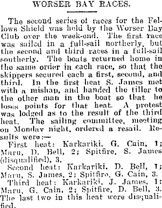 WORSER BAY RACES. The second series ol races for the Fellows Shield was held by the Worser Bay Club over the week-end. The first race was sailed in a full-sail northerly, but the second and third races in a full-sail southerly. The boats returned home in ilio same order in each race, so that the skippers secured each a first, second, and third. In the first heat S. James met with .a mishap, and handed the tiller to the other man in the boat so that he loses points for that heat. -A protest was lodged as to the result of the third heat. The sailing committee, meeting on Monday night, ordered a resail. Results were: — First heat: Karkariki, G. Cain, I; Maru, D. Bell, 2; Spitfire, S. James (disqualified), 3. Second heat: Karkariki. D. Bell, 1; Maru, S. James, 2; Spitfire. G. Cain, 3. Third heat : Karkariki. J. James, 1: Maru. G. Cain, 2: Spitfire, D. Bell, 3. The last two in this heat were disqualified.