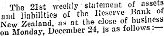 The 21st weekly statement of assets and liabilities of the Reserve Bank: of New Zealand, as at the close ot business on Monday, December 24, is as follows .