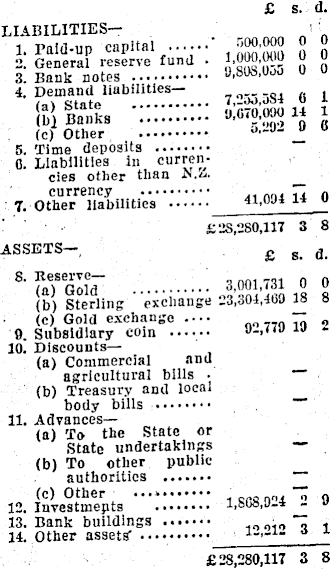 £ s. d. LIABILITIES1. Paid-up capital ...... MO.OOO 2. General reserve fund . 1,000, 3. Bank notes J,808,0>w 0 0 0 0 0 0 4. Demand liabilities— 6 1 an Banks V,670,030 14 1 9 6 0. Liabilities in currencies other than M.E. — currency • •• . 7. Other liabilities 41.OJ1 14 0 £28,280,117 3 8 ASSETS— £ s. d. 8. Reserve— (a) Gold o.001, nil (b) Sterling exchange 23,304,460 0 18 0 8 (c) Gold exchange .... 9. Subsidiary coin J-,mv 19 2 10. Discounts— (a) Commercial and agricultural bills . (b) Treasury and local body bills — 11. Advances— (a) To the State or State undertakings —— (b) To other public authorities — ■ 12. Investmepts 1,868,924 - 9 £23,280,117 3 8