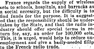 France regards the supply of wireless sets to schools, hospitals, and barracks as a social necessity, but the difficulty is to find funds for the purpose. It is suggested that the responsibility should be undertaken by the State, and that the radio industry should offer special terms in return for, say, an order for 100,000 sets. This, jt is urged, would help to reduce unemployment aud give a badly-needed fillip lo the French radio trade.
