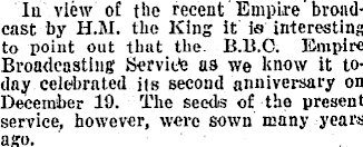 lu view of the recent Empire broadcast by H.M. the King it is interesting to point out that the 8.8. C. Empire Broadcasting Service as we know it today celebrated its second anniversary on December 19. The seeds of the present service, however, were sown many years ago.