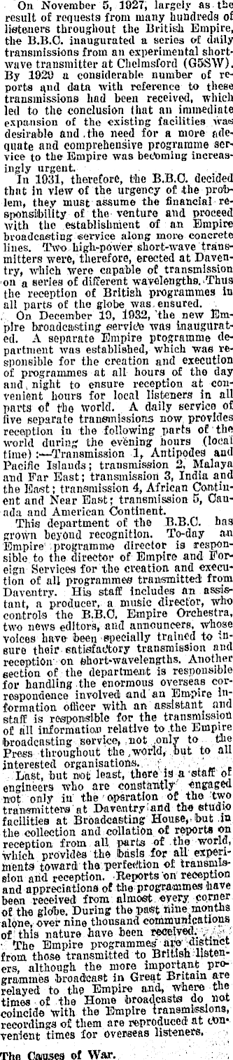 On November 5, 1927, largely as the result of requests from many hundreds of listeners throughout the British Empire, the 8.8. C. inaugurated a series of daily transmissions from an experimental shortwave transmitter at Chelmsford (GSSW). By 1929 a considerable number of reports and data with reference to these transmissions had been received, which led to the conclusion that an immediate expansion of the existing facilities was desirable and .the need for a more adequate and comprehensive programme service to the Empire was becoming increasingly urgent. In 1931, therefore, the 8.8. C. decided that in view of the urgency of the problem, they must assume the financial responsibility of the venture and proceed with the establishment of an Empire broadcasting service along more concrete lines. Two high-power short-wave transmitters were, therefore, erected at Daventry, which were capable of transmission on a series of different wavelengths. Thus the reception of British programmes in all parts of the globe was ensured. On December 19, 1932, the new Empire broadcasting eervide was inaugurated. A separate Empire programme department was established, which was responsible for the creation and execution of programmes at all hours of the day and night to ensure reception at convenient hours for local listeners in all parts of the world. A daily service of five separate transmissions now provides reception in the following parts of the world during the evening hours (local time):—Transmission 1, Antipodes and Pacific Islands; transmission 2, Malaya and Far East; transmission 3, India and the East: transmission 4, African Continent and Near East; transmission 5, Canada and American Continent. This department of the 8.8. C. has grown beyond recognition. To-day a.n Empire programme director is responsible to the director of Empire and Foreign Services for the creation and execution of all programmes transmitted from Daventry. His staff includes an assistant, a producer, a music director, who controls the 8.8. C. Empire Orchestra, two news editors, and announcers, whose voices have been specially trained to insure their satisfactory transmission and reception on short-wavelengths. Another section of the department is responsible for handling the enormous overseas correspondence involved and an Empire information officer with an assistant and staff is responsible for the transmission of all information relative to the Empire broadcasting service, not .only to the Press throughout the world, but to all interested organisations. ■ ,' . Last, but not least, there is a staff of engineers who are constantly engaged not only in the operation of the two transmitters at Daventry and the studio facilities at Broadcasting House, but in the collection and collation of reports on reception from all parts of the world, which provides the basis for all expenmente toward the perfection of transmission and reception. Reports on reception and appreciations of the programmes have been received from almost every corner of the globe. During the past nine months alone, over nine thousand communications of this nature have been received.. The Empire programmes aye' distinct from those transmitted to British listeners, although the more important programmes broadcast in Great Britain are relayed to the Empire and, Where tne times of the Home broadcasts do not coincide with the Empire transmissions, recordings of them are reproduced at convenient times for overseas listeners. The Causes of War.