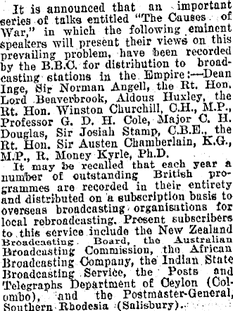 It is announced that an important series of talks entitled “The Causes of War,” in which the following eminent speakers will present their views on this prevailing problem, have been recorded by the 8.8. C. for distribution to broadcasting stations in the Empire:—Dean Inge, Sir Norman Angell, the Rt. Hon. Lord Beaverbrook, Aldous Huxley, the Rt. Hon. Winston Churchill, C.H., M.P., Professor G. D. H. Cole, Major C. H. Douglas, Sir Josiah Stamp, C.8.E., the Rt. Hon. Sir Austen Chamberlain, K.G., M.P., R. Money Kyrle, Ph.D. It may be recalled that each year a number of outstanding British programmes are recorded in their entirety and distributed on a subscription, basis to overseas broadcasting organisations for local rebroadcasting. Present subscribers to this service include the New Zealand Board, the Australian Broadcasting Commission, thn African Broadcasting Company, the Indian btate Broadcasting Service, the Posts and Telegraphs Department of Ceylon (Colombo), and the Postmaster-General, Southern Rhodesia (Salisbury).