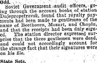 Odd - .a Soviet Government .audit officers, going through the account books of station Dnepropetrovsk, found that royalty payments had been made to gentlemen of the name of Beethoven, Mozart, and Chopin, and that the receipts hud been duly signed. The station director expressed surprise that the three gentlemen were dead, and could not accordingly account for the strange fact that their signatures were on his file. State Sets.