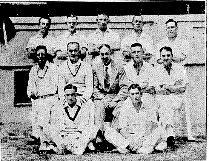 Mercantile League Cricket.— Teams representing Wanganui and Wellington, who commenced a two-day match at Athletic Park yesterday. Left: The Wanganui team- Back row: C . Smith G. McDougal, W. A. Davidson. O. R. Holland, H. Lowe. Middle row: W. Evans, L. A. Wilson, K. H. Cave (manager), R. J. Sewell (captain). H. Thomas. Front row: G. Thrush C. Byeas. Right—the Wellington team: Back row-E. Napier (umpire), W. Condliffe, E. T. H. Robinson, W. Johnson, L. Foley, O. Johnson, J. McGillivray (umpire). Middle row: J. Melville, J. H. James (captain), W. R. King (manager), N. Aldridge, F. Swain. Front row: T. Tucker, W. Jupp.