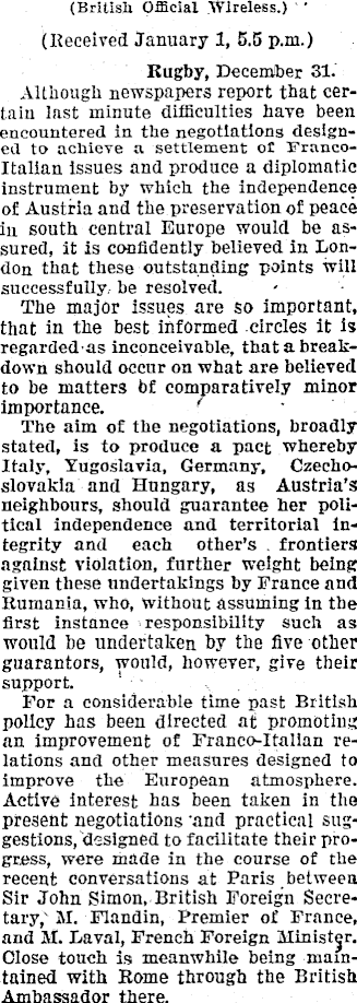 (British Official Wireless.) ' (Received January 1, 5.5 p.m.) Rugby, December 31. Although newspapers report that certain last minute difficulties have been encountered in the negotiations designed to achieve a settlement of FrancoItalian issues and produce a diplomatic instrument by which the independence of Austria and the preservation of peace in south central Europe would be assured, it is confidently believed in London that these outstanding points will successfully be resolved. The major issues are so important, that in the best informed circles it is regarded as inconceivable, that a breakdown should occur on what are believed to be matters bf comparatively minor importance. The aim of the negotiations, broadly stated, is to produce a pact whereby Italy, Yugoslavia, Germany, Czechoslovakia and Hungary, as Austria’s neighbours, should guarantee her political independence and territorial integrity and each other’s frontiers against violation, further weight being given these undertakings by France and Rumania, who, without assuming in the first instance responsibility such as would be undertaken by the five other guarantors, would, however, give their support. For a considerable time past British policy has been directed at promoting an improvement of Franco-Italian relations and other measures designed to improve the European atmosphere. Active interest has been taken in the present negotiations 'and practical suggestions, designed to facilitate their progress, were made in the course of the recent conversations at Paris between Sir John Simon, British Foreign Secretary, M. Flandin, Premier of France, and M. Laval, French Foreign Minister. Close touch is meanwhile being maintained with Rome through the British Ambassador there.