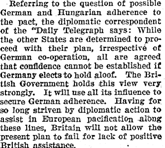 Referring to the question of possible German and Hungarian adherence to the pact, the diplomatic correspondent of the "Daily Telegraph says: While the other States are determined to proceed with their plan, irrespective of German co-operation, all are agreed that confidence cannot be established if Germany elects to hold aloof. The British Government holds this view very strongly. It will use all its influence to secure German adherence. Having for so long striven by diplomatic action to assist in European pacification along these lines, Britain will not allow the present plan to fail for lack of positive British assistance.