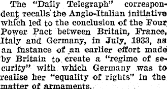 The “Daily Telegraph” correspondent recalls tie Anglo-Italian initiative which led to the conclusion of the Four Power Pact between Britain, France, Italy and Germany, in July, 1933, as an Instance of an earlier effort made by Britain to create a “regime of security” with which Germany was to realise her “equality of rights” in the matter of armaments.