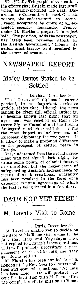 The “Daily Telegraph” also mentions the efforts that Britain made last April when, having modified the draft Disarmament Convention to meet German wishes, she endeavoured to secure French, acceptance by offers of an extended security guarantee. France, under M. Barthou, prepared to reject both. The position, adds the newspaper, has lately been reviewed afresh by the British Government, ‘ though its action must largely be determined by the course of events. NEWSPAPER REPORT 4 Major Issues Stated to be Settled London, December 30. The “Observer’s” diplomatic correspondent, in an important exclusive article, states that although the news cannot be given full official authority, it became known last night that an agreement was reached at Rome between Signor Mussolini and the French Ambassador, which constituted by far the most important achievement of European diplomacy for two years. It is likely to make a profound difference to the prospect of settled peace in Europe. It is understood that the actual agreement was not signed last night, because some points of colonial interest are unsettled, but the major issue of safeguarding Austria’s independence by means of an international guarantee has been resolved in the form of a categoric written agreement of which the text is being issued in a few days. DATE NOT YET FIXED M. Laval’s Visit to Rome Paris, December 30. M. Laval is unable yet to decide on the date of his Rome visit owing to the fact that Italy and Yugoslavia have not replied to France's latest questions. This will probably necessitate a postponement of the visit until the Saar question is settled. ■ M. Flandin has been invited to visit London at the New Year to discuss political and economic questions. No- date has been fixed. He will probably accept the invitation with M. Laval after the completion of the mission to Rome.