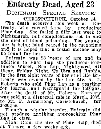 Entreaty Dead, Aged 23 Dominion Special Service. CHRISTCHURCH, October 14. The death occurred this week of Entreaty, who earned fame by producing Phar Lap. She foaled a filly last week to Nightmarch, but complications set in and she died of blood poisoning.. The youngster is being hand reared in the meantime and it is hoped that a. foster mother may be found for her. Entreaty was 23 years of age and in addition to Phar Lap she produced Fortune’s Wheel, ,Nea Lap, Nightguard. AU Clear, Friday Night, Te Uira and Raphis. In the first eight years of her stud life Entreaty was owned by the late Mr. A. F. Roberts who sold Phar Lap as a yearling for ICOgns., and Nightguard for loOOgns. After the death of Mr. Roberts, Entreaty was sold at a dispersal sale in March, 1032, to Mr. F. Armstrong, Christchurch, for luOOgns. Though a regular breeder, Entreaty did not produce anything approaching Phar Lan in class. Night Raid, the sire of Phar Lap. died at Timaru a few weeks ago.