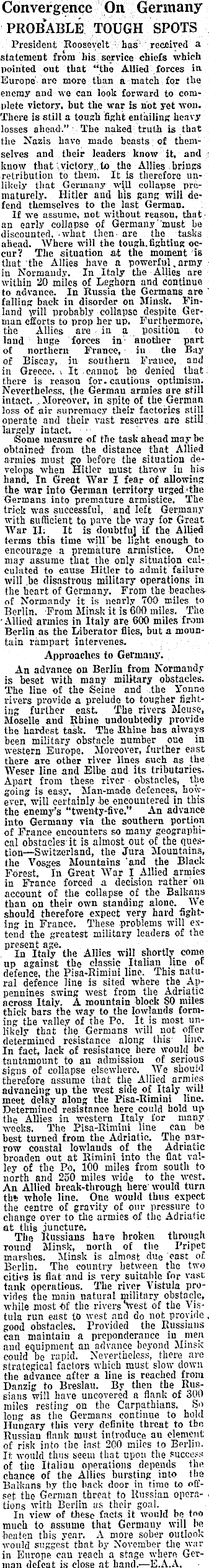 Convergence On Germany PROBABLE TOUGH SPOTS President Roosevelt has received a statement from his service chiefs which pointed out that “the Allied forces in Europe are more than a match for the enemy and we can look forward to complete victory, but the war is not yet won. There is still a tough fight entailing heavy losses ahead.” The naked truth is that the Nazis have made beasts of themselves and their leaders know it, and know that victory to the Allies brings retribution to them. It is therefore unlikely that Germany will collapse prematurely. Hitler and his gang will defend themselves to the last German. If we assume, not without reason, that an early collapse of Germany' must be discounted, what then are the tasks ahead. Where will the tough, fighting occur? The situation at the moment is that the Allies have a powerful, army in Normandy. In Italy the Allies are within 20 miles of Leghorn and continue to advance. In Russia the Germans are falling back in disorder on Minsk. Finland will probably collapse despite German efforts to prop her up. Furthermore, the Allies are in a position to land huge forces in another part of northern France, iu the Bay of Biscay, in southern France, and in Greece. , It cannot b.e denied that there is reason for. cautious optimism. Nevertheless, the German armies are still intact. Moreover, in spite of the German loss of air supremacy their factories still operate and their vast reserves are still largely intact. Some measure of the task ahead may be obtained' from the distance that Allied armies must go before the situation develops when Hitler must throw in his hand. In Great War I fear of allowing the war into German territory urged‘the Germans into premature armistice. The trick was successful, and left Germany with sufficient to pave the way for Great War 11. It is doubtfu] if the Allied terms this time will be light enough to encourage a premature armistice. One may assume that the only situation calculated to cause Hitler to admit failure will be disastrous military operations in the heart of Germany. From the beaches of Normandy it is nearly 700 miles to Berlin. From Minsk it is 600 miles. The ■ Allied armies in Italy are 600 miles from Berlin as the Liberator flies, but a mountain rampart intervenes. Approaches to Germany. An advance on Berlin from Normandy is beset with many military obstacles. The line of the Seine and the Yonne rivers provide a prelude to tougher fighting further east. The rivers Meuse, Moselle and Rhine undoubtedly provide the hardest task. The Rhine has always been military obstacle number one in western Europe. Moreover, further east there are other river lines such as the Weser line and Elbe aud its tributaries. Apart from these river obstacles, the going is easy. Man-made defences, however, will certainly be encountered in this the enemy’s “twenty-five.” An advance into Germany via the southern portion of France encounters so many geographical obstacles it is almost out of the question —Switzerland, the Jura Mountains, the Vosges Mountains 'and the Black Forest. In Great War I Allied armies in France forced a decision rather on account of the collapse of the Balkans than on their own standing alone. We should therefore expect very hard fighting in France. These problems will extend the greatest military leaders of the present age. In Italy the Allies will shortly come up against the classic Italian line of defence, the Pisa-Rimini line. This natural defence line is sited where the .Appennines swing west from the Adriatic across Italy. A mountain block SO miles thick bars the way to the lowlands forming the valley of the Po. It is most unlikely that the Germans will not offer determined resistance along this line. In fact, lack of resistance here would be tantamount to an admission of serious signs of collapse elsewhere. We should therefore assume that the Allied armies advancing up the west side of Italy will meet delay along the Pisa-Rimini line. Determined resistance here could hold up the Allies in western Italy for many • weeks. The Pisa-Rimini line can be best turned from the Adriatic. The narrow coastal lowlands of the Adriatic broaden out at Rimini into the flat valley of the Po, 160 miles from south to north and 250 miles wide to the west. An Allied break-through here’would turn ths whole line. One would thus expect the centre of gravity of our pressure to change over to the armies of the Adriatic at this juncture. The Russians have broken through round Minsk, north of the Pripet marshes. Minsk is almost due cast of Berlin. Tlie country between the two cities is flat and is very suitable for vast tank operations. The river Vistula provides the main natural military obstacle, while most <>f the rivers Vest of the Vistula run east to west and do not provide . good obstacles. Provided the Russians can maintain a preponderance in men and equipment an advance beyond Minsk could be rapid. Nevertheless, there are strategical factors which must slow down the advance after a line is reached from Danzig to Breslau. By then the Russians will have uncovered a flank of 300 miles resting on the Carpathians. So long as the Germans continue to hold Hungary this very definite threat to the Russian flank must introduce an element of risk into (be last 200 miles to Berlin. It would thus seem that upon the success of tlie Italian operations depends the chance of the Allies bursting into the Balkans by the back door in time to offset the German threat to Russian opera- ■ tions with Berlin as their goal. In view of these facts it would be too much to assume that Germany will be beaten this year. A more sober outlook would suggest that by November tlie war in Europe can reach a stage where German defeat is close at hand. —E.A.A.