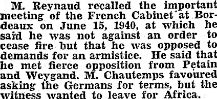 M. Reynaud recalled the important meeting of the French Cabinet at Bordeaux on June 15, 1940, at which he said he was not against an order to cease fire but that he was opposed to demands for an armistice. He said that he met fierce opposition from Petain and Weygand. M. Chautemps favoured asking the Germans for terms, but the witness wanted to leave for Africa.
