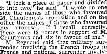 "I took a piece of paper and divided it into two," he said. "I wrote on one side the names of those who favoured M. Chautemps's proposition and on the other the names of those who favoured my proposal. If I recall correctly, there were 13 names in support of M. Chautemps and six in favour of me." M. Reynaud said that military surrender involving the French troops in France and national surrender involv-