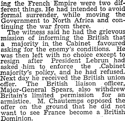 ing the French Empire were two different things. He had intended to avoid formal surrender, while moving the Government to North Africa and continuing the war from there. The witness said he had the grievous mission of informing the British that a majority in the Cabinet favoured asking for the enemy's conditions. He was then left with no choice except to resign after President Lebrun had asked -him to enforce the .Cabinet majority's policy, and he had refused. Next day he received the British union, offer. The British liaison officer, Major-General Spears, also withdrew Britain's limited permission for an armistice. M. Chautemps opposed the offer on the ground that he did not want to see France become a British Dominion.