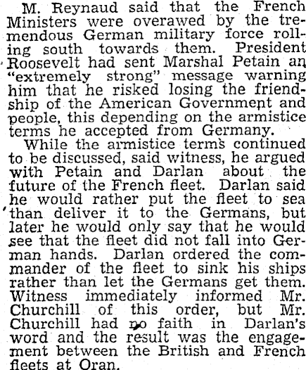 M. Reynaud said that the French Ministers were overawed by the tremendous German military force rolling south towards them. President 'Hoosevelt had sent Marshal Petain an. "extremely strong" message -warning him that he risked losing the friendship of-the American Government and people, this depending on the armistice terms he accepted from Germany. While the armistice terms continued to be discussed, said witness, he argued with Petain and Darlan about. the future of the French fleet. Darlan said he would rather put the fleet to sea 'than deliver it to the Germans, but later he would only say that he would see that the fleet did not fall into German hands. Darlan ordered the commander of the fleet to sink his ships rather than let the Germans get them. Witness immediately informed Mr. Churchill of this order, but Mr. Churchill had i>o faith in Darlan's word and the result was the engagement between the British and French fleets at Oran.