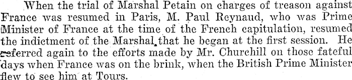 When the trial of Marshal Petain on charges of treason against France was resumed in Paris, M. Paul Reynaud, who was Prime Minister of France at the time of the French capitulation, resumed the indictment of the Marshal,that he began at the first session. He referred again to the efforts made by Mr. Churchill on those fateful days when France was on the brink, when the British Prime Minister flew to see him at Tours.