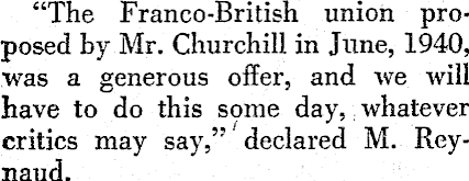 "The Franco-British union proposed by Mr. Churchill in' June, 1940, was a generous offer, and we will have to do this some day, whatever critics may say," declared M. Reynaud.