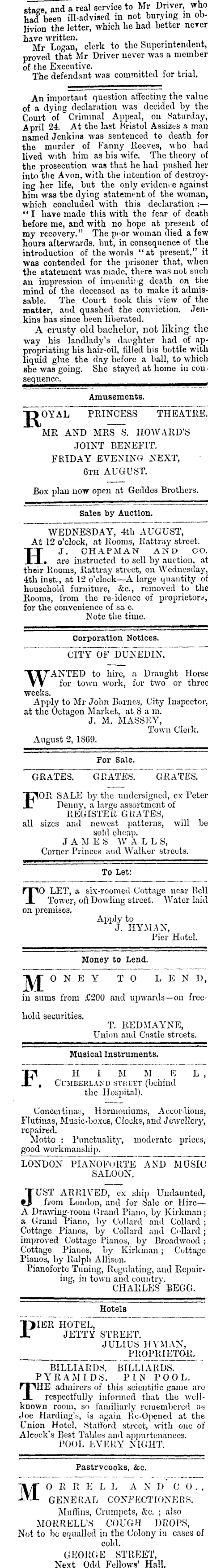 stage, and a real service to Mr Driver, who had been ill-advised in not burying in oblivion the letter, which he had better never have written. . , , . Mr Logan, clerk to the Superintendent, proved that Mr Driver never was a member of the Executive. The defendant was committed for trial. An important question affecting the value of a dying declaration was decided by the Court of Criminal Appeal, on Saturday, April 24. At the last Bristol Assizes a man named Jenkins was sentenced to death for the murder of Fanny Reeves, who had lived with him as his wife. The theory of the prosecution was that he had pushed her into the Avon, with the intention of destroying her life, but the only evidence against him was the dying statement of the woman, which concluded with this declaration : “I have made this with the fear of death before me, and with no hope at present of my recovery.” The poor woman died a few hours afterwards, but, in consequence of the introduction of the words “at present,” it was contended for the prisoner that, when the statement was made, there was not such an impression of impending death on the mind of the deceased as to make it admissable. The Court took this view of the matter, and quashed the conviction. Jenkins has since been liberated. A crusty old bachelor, not liking the way his landlady’s daughter had of appropriating his hair-oil, filled his bottle with liquid glue the day before a ball, to which she was going. She stayed at home in consequence. Amusements. JJOYAL PRINCESS THEATRE. MR AND MRS S. HOWARD’S JOINT BENEFIT. FRIDAY EVENING NEXT, 6th AUGUST. Box plan now open at Geddes Brothers. Sales by Auction. WEDNESDAY, 4th AUGUST, At 12 o’clock, at Rooms, Rattray street. HJ. CHAPMAN AND CO. . are instructed to sell by auction, at their Rooms, Rattray street, on Wednesday, 4th inst., at 12 o’clock—A large quantity of household furniture, &c., removed to the Rooms, from the re ideuce of proprietors, for the convenience of sue. Note the time. Corporation Notices. CITY OF DUNEDIN. WANTED to hire, a Draught Horse for town work, for two or three weeks. Apply to Mr John Barnes, City Inspector, at the Octagon Market, at 8 a m. J. M. MASSEY, Town Clerk. August 2, 1869. For Sale. GRATES. GRATES. GRATES. FOR SALE by the undersigned, ex Peter Denny, a large assortment of REGISTER GRATES, all sizes and newest patterns, will be sold cheap. JAMES WALLS, Corner Princes and Walker streets. To Let: TO LEI', a six-roomed Cottage near Bell Tower, oft Dowling street. Water laid on premises. Apply to J. HYMAN, Pier Hotel. Money to Lend. jyj" ONEY TO LEND, in sums from £2OO and upwards—on freehold securities, T. REDMAYNE, Union and Castle streets. Musical Instruments. FH I M M E L , , Cl'HßErlaxd stkket (behind the Hosjntal). Concertinas, Harmoniums, Accordions, Flutinas, Music-boxes, Clocks, and Jewellery, repaired. Motto : Punctuality, moderate prices, good workmanship. LONDON PI AN OFuRTE ~A U SIC SALOON. JUST ARRIVED, ex ship Undaunted, from Loudon, and for Sale or Hire— A Drawing-room Grand Piano, by Kirkman; a Grand Piano, by Collard and Collard; Cottage Pianos, by Collard and Collard; improved Cottage Pianos, by Broadwood ; Cottage Pianos, by Kirkman; Cottage Pianos, by Ralph Allison. Pianoforte Tuning, Regulating, and Repairing, in town and country. CHARLES BEGG. Hotels PIER HOTEL^ JETTY STREET. JULIUS HYMAN, PROPRIETOR. BILLIARDS. BILLIxVRDS. PYRAMIDS. PIN POOL. THE admirers of this scientific game are respectfully informed that the wellknown room, so familiarly remembered as Joe Harding’s, is again Rc-Opened at the Union Hotel, Stafford street, with one of Alcock's Best Tables and appurtenances. POOL EVERY NIGHT. Pastrycooks, &c. MO R R ELL A N D* C 0. , GENE UAL CONFECTIONERS. Muffins, Crumpets, &c. ; also MORRELL’S COUGH DROPS, Not to be equalled in the Colony in cases of cold. GEORGE STREET, Next Odd Fellow's’ Hall,
