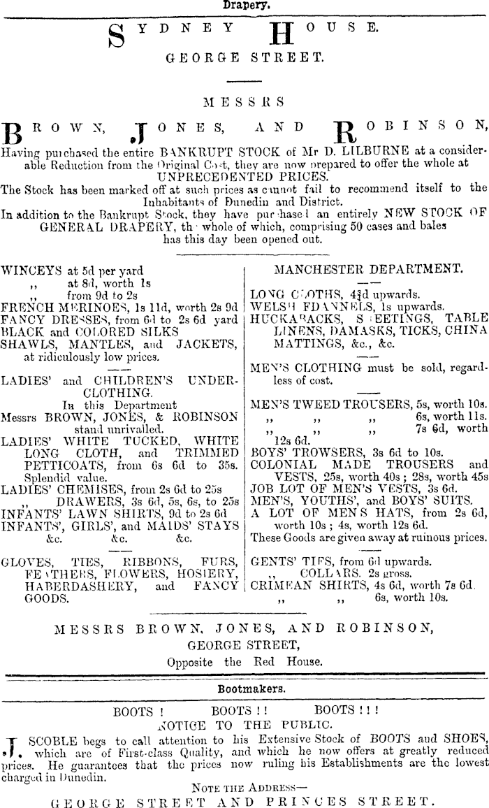 Drapery. gYD N E Y GEORGE STREET. House. MESSRS ONES, AND 0 B I N S 0 N, gRO WN. JONES, AND R Having pmcbased the entire B\NKRUPT STOCK of Mr D. LILBURNE at a considerable Reduction from the Original Cod;, they are now prepared to offer the whole at UNPRECEDENTED PRICES. The Stock has been marked off at such prices as cannot fail to recommend itself to the Inhabitants of Dunedin and District. In addition to the Bankrupt Stock, they have pur-base I an entirely NEW STOCK OF GENERAL DRAPERY, th ' whole of which, comprising 50 cases and bales has this day been opened out. WINCEYS at 5d per yard ~ at Bd, worth Is ~ from 9d to 2s FRENCH MERINOES, Is lid, worth 2s 9d FANCY DRESSES, from 6d to 2s 6d yard BLACK and COLORED SILKS SHAWLS, MANTLES, and JACKETS, at ridiculously low prices. LADIES’ and CHILDREN’S UNDERCLOTHING. In this Department Messrs BROWN, JONES, & ROBINSON stand unrivalled. LADIES’ WHITE TUCKED, WHITE LONG CLOTH, and TRIMMED PETTICOATS, from Gs Gd to 355. Splendid value. LADIES’ CHEMISES, from 2s Gd to 25s ~ DRAWERS, 3s Gd, ss, 6s, to 25s INFANTS’ LAWN SHIRTS, 9d to 2s Gd INFANTS’, GIRLS’, and MAIDS’ STAYS &c. &c. &c. GLOVES, TIES, RIBBONS, FURS, FE’TREKS, FLOWERS, HOSIERY, HABERDASHERY, aud FANCY GOODS. MANCHESTER DEPARTMENT, LONG CLOTHS, 4fd upwards. WELSH FD ANN ELS, Is upwards. HUCKABACKS, S iEETINGS, TABLE LINENS, DAMASKS, TICKS, CHINA MATTINGS, &c., &c. MEN’S CLOTHING must be sold, regardless of cost. MEN’S TWEED TROUSERS, ss, worth 10s. ~ ~ ~ 6s, worth 11s. ~ ~ ~ 7s 6d, worth 12s Gd. BOYS’ TROWSERS, 3s 6d to 10s. COLONIAL MADE TROUSERS aud VESTS, 255, worth 40s ; 28s, worth 45s JOB LOT OF MEN’S VESTS, 3s 6d. MEN’S, YOUTHS’, and BOYS’ SUITS. A LOT OF MEN S HATS, from 2s Gd, worth 10s ; 4s, worth 12s Gd. These Goods are given away at ruinous prices. GENTS’ TIPS, from Gd upwards. ~ COLL ARS. 2s «ross. CRIMEAN SHIRTS, 4s Gd, worth 7s Gd, ~ ~ 6s, worth 10s. MESSRS BROWN, JONES, AND ROBINSON, GEORGE STREET, Opposite the Red House. Bootmakers. BOOTS ! BOOTS ! ! BOOTS ! ! ! NOTICE TO THE PUBLIC. TSCOBLE hegs to call attention to his Extensive Stock of BOOTS and SHOES, . which are of First-class Quality, and which he now offers at greatly reduced prices. He guarantees that the prices now ruling bis Establishments are the lowest charged in Dunedin. Note the Address — GEORGE STREET AND PRINCES STREET.